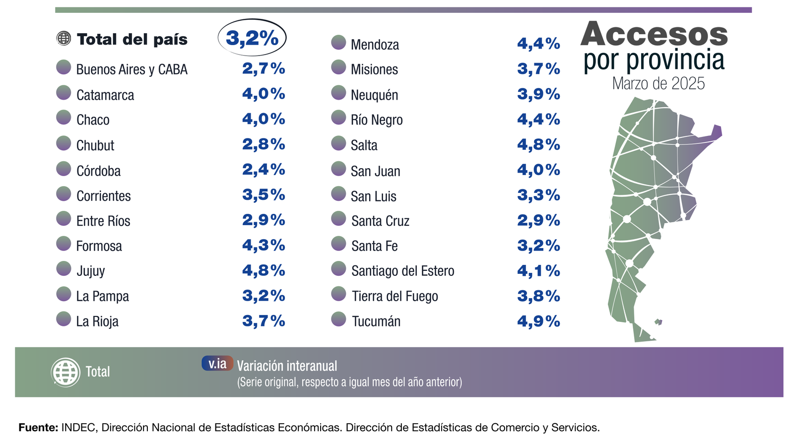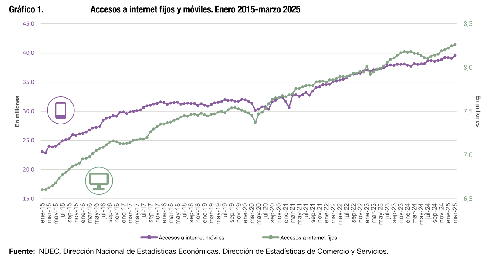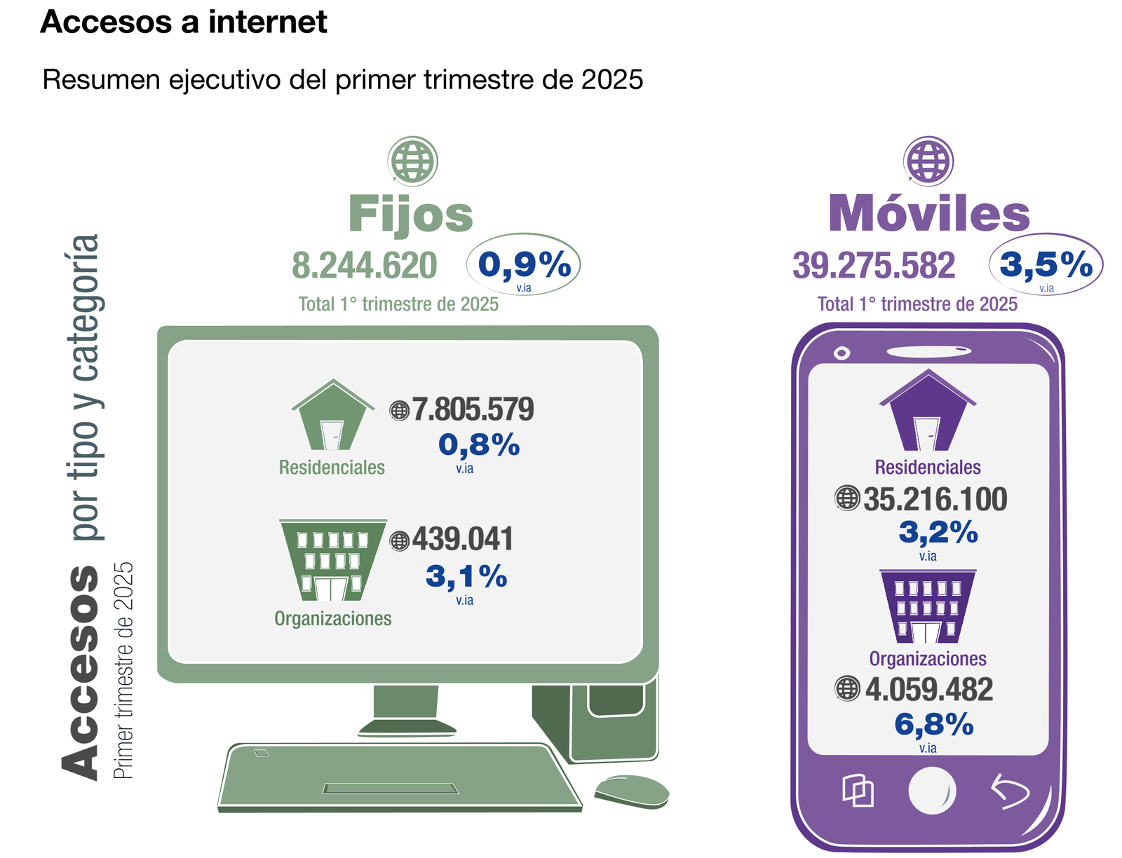 En el primer trimestre de 2025 se registraron, en promedio, 8.244.620 accesos a internet fijos. Esto significó un aumento de 0,9% respecto al primer trimestre de 2024.