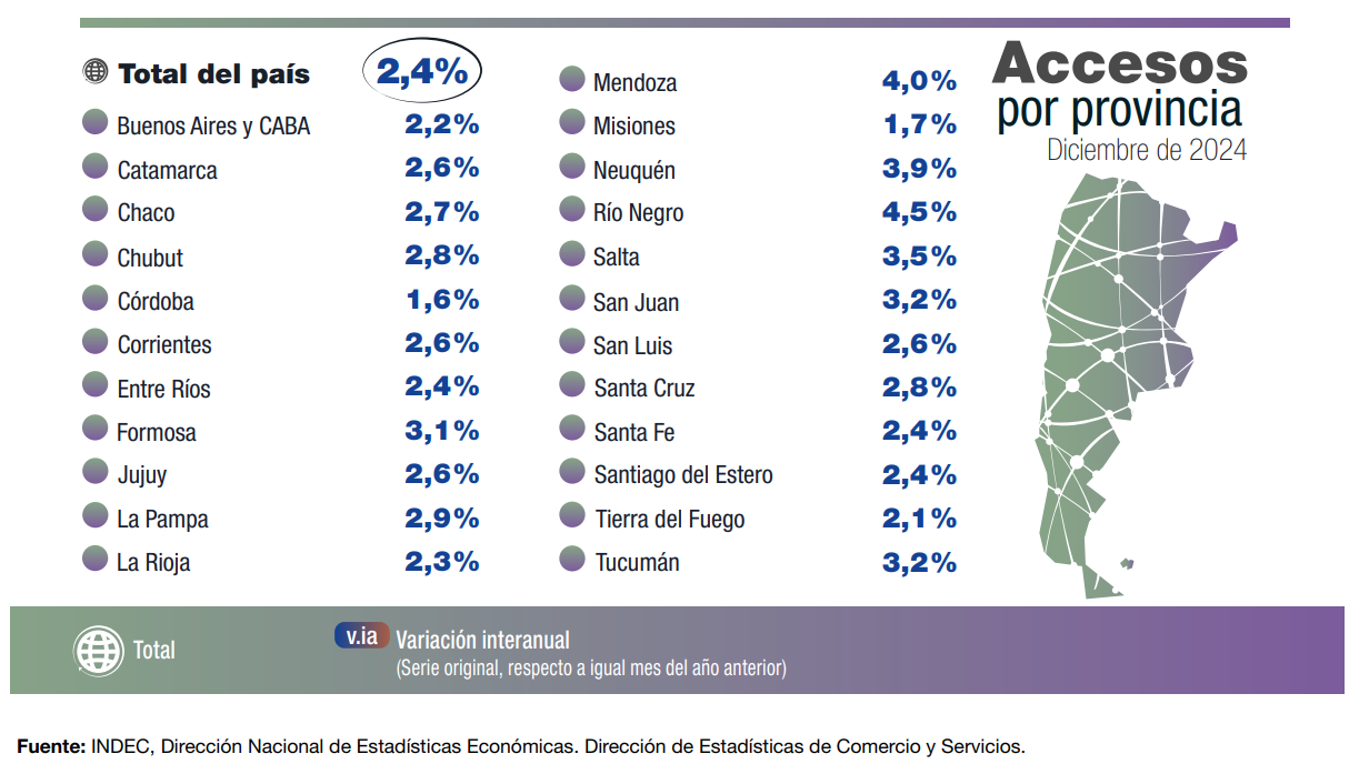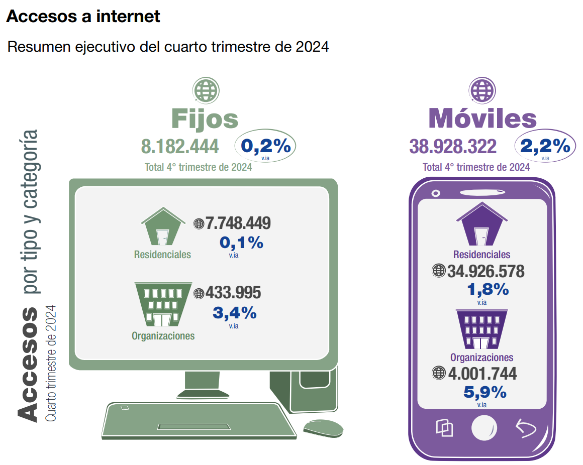 En el cuarto trimestre de 2024 se registraron, en promedio, 8.182.444 accesos a internet fijos. Esto significó un aumento de 0,2% respecto al cuarto trimestre de 2023. Por otro lado, los accesos fijos residenciales crecieron 0,1%, lo que suma un total de 7.748.449; y los accesos fijos de organizaciones totalizaron 433.995, con una suba de 3,4%.