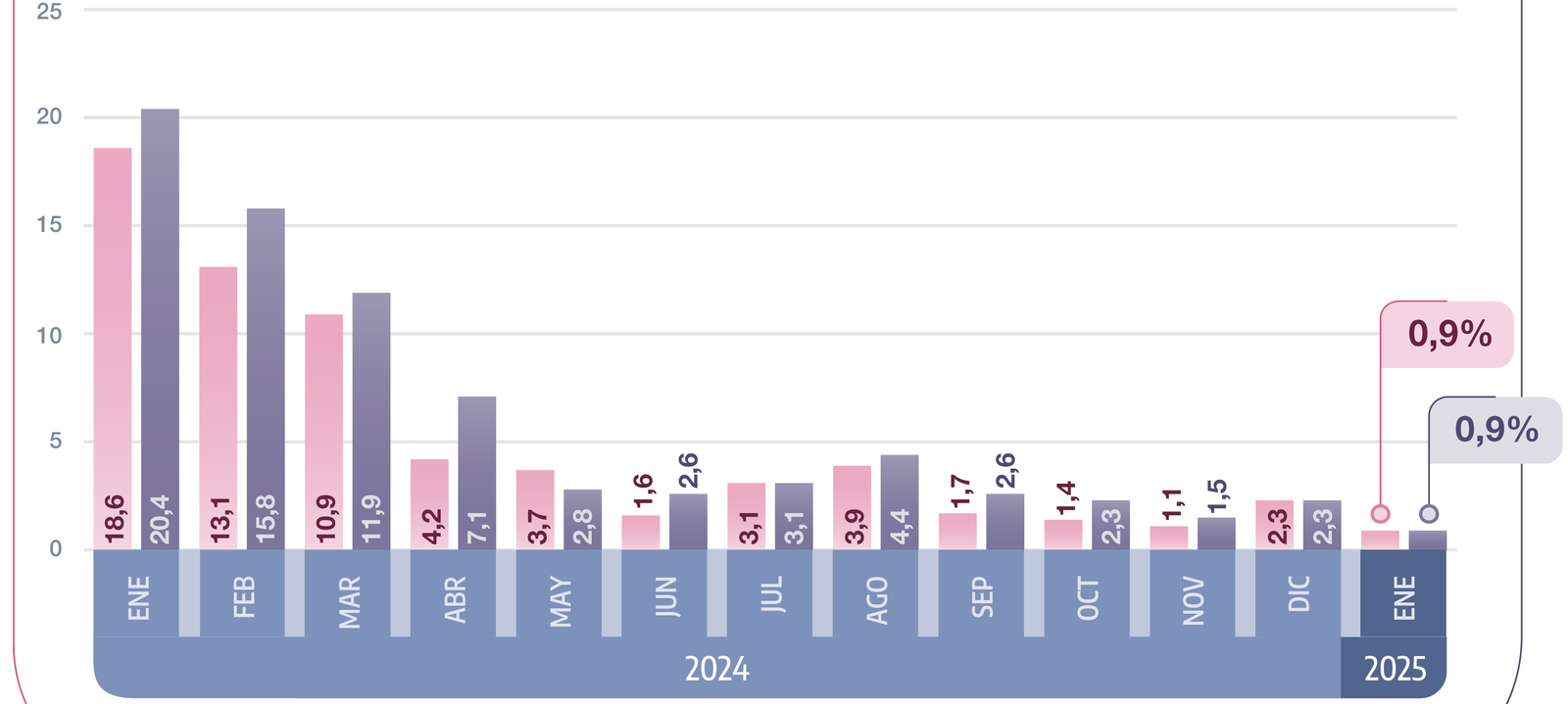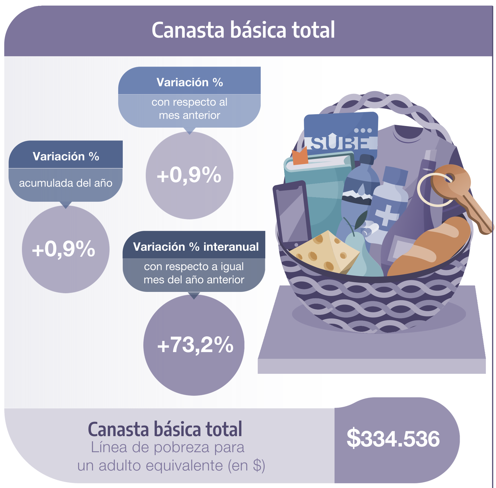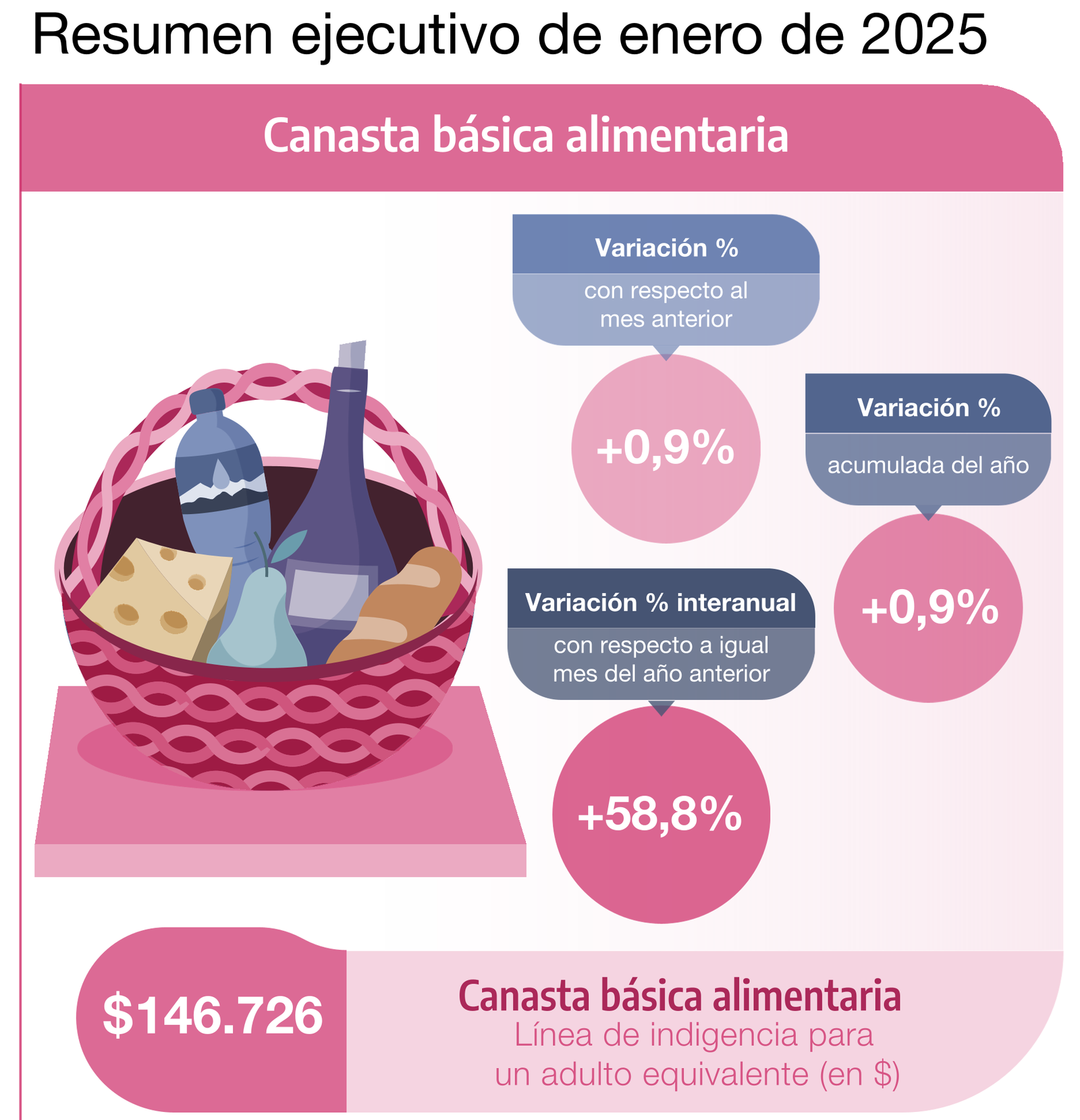 Durante enero de 2025, la variación mensual de la canasta básica alimentaria (CBA) y de la canasta básica total (CBT) fue de 0,9%.