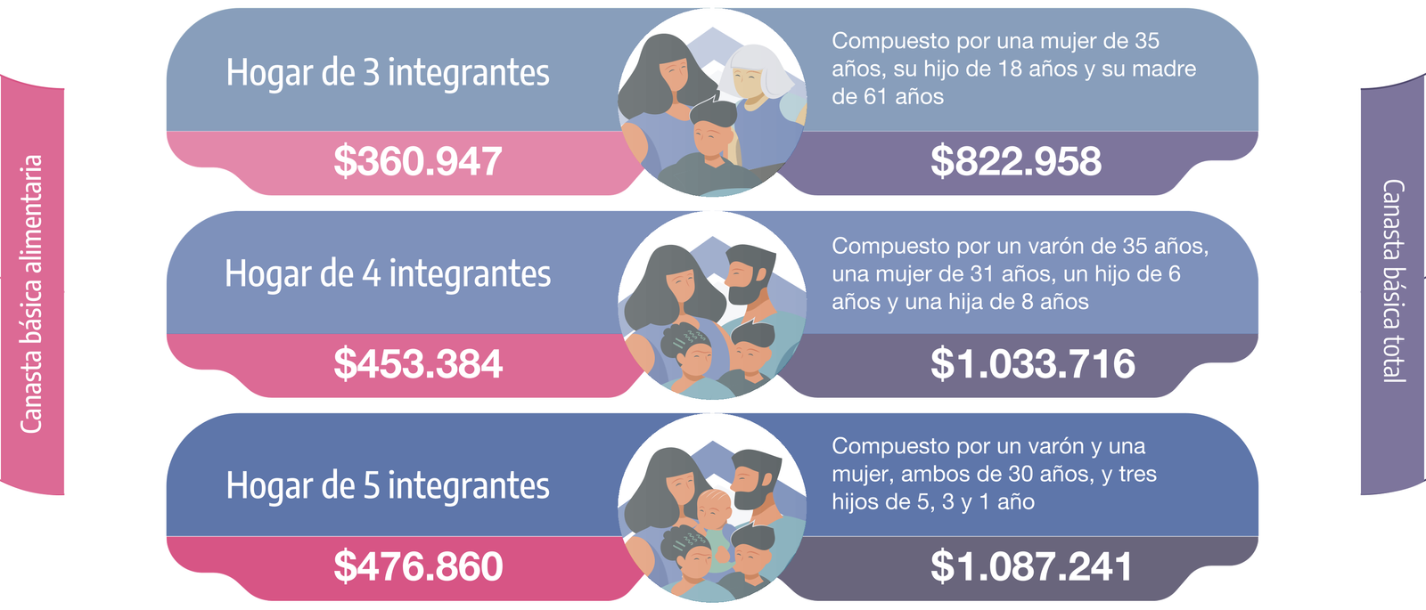 En los cuadros 1 y 2, se presentan los valores mensuales de la CBA y de la CBT del adulto equivalente, junto a tres ejemplos de distintos tipos de hogares. Se incluyen, además, las