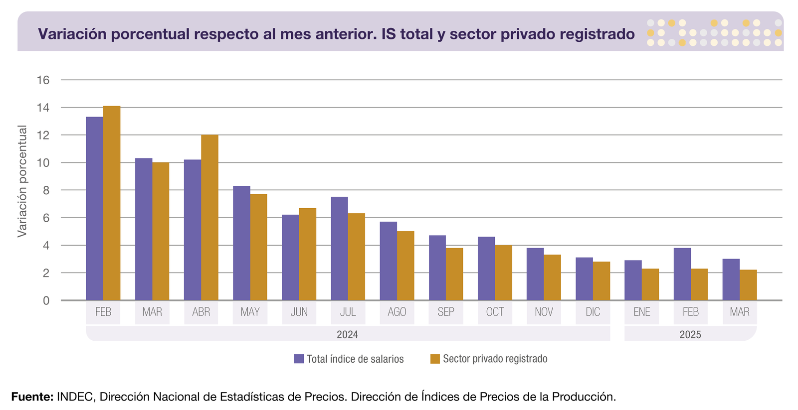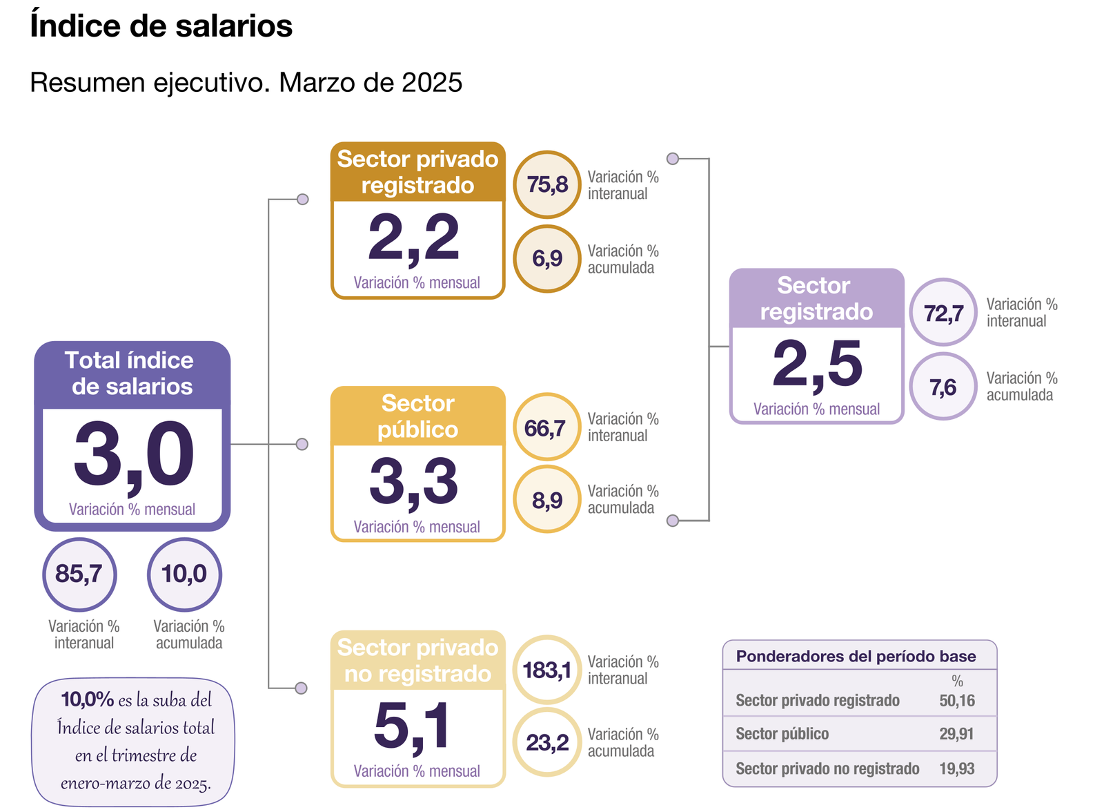 En marzo de 2025, el índice de salarios se incrementó 3,0% mensual y 85,7% interanual. El indicador acumula una suba de 10,0% respecto de diciembre previo. El crecimiento mensual se debe