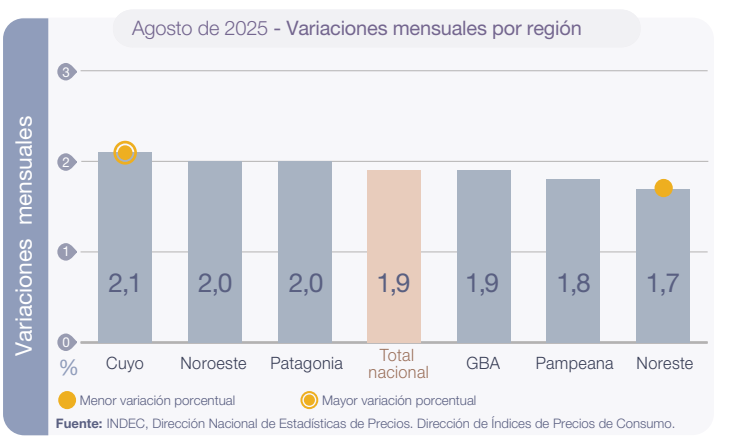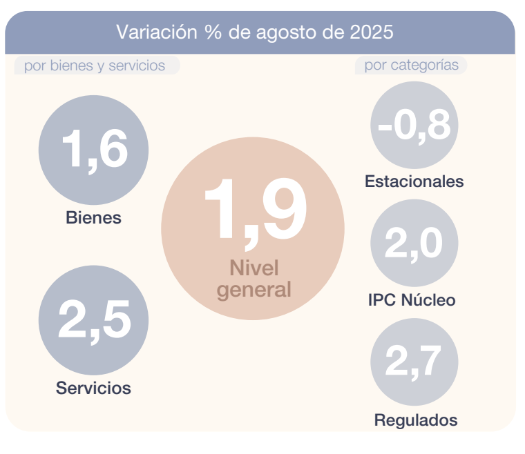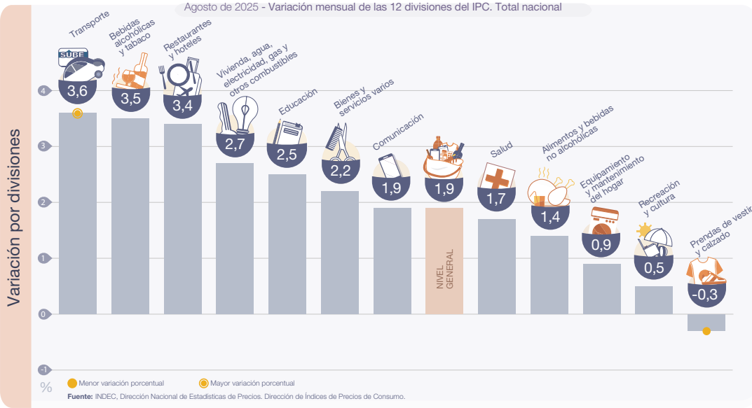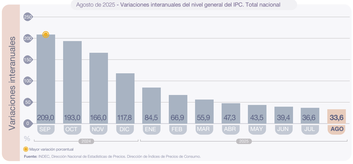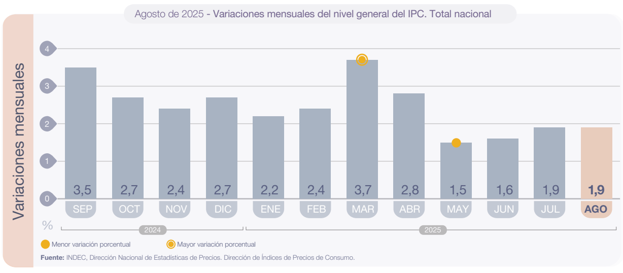 El Nivel general del Índice de precios al consumidor registró un alza mensual de 1,9% en agosto de 2025, y acumuló en el año una variación de 19,5%. En la comparación interanual, el incremento alcanzó el 33,6%.