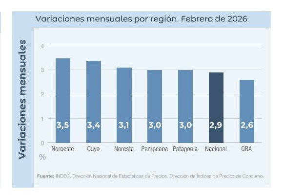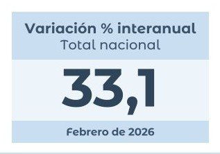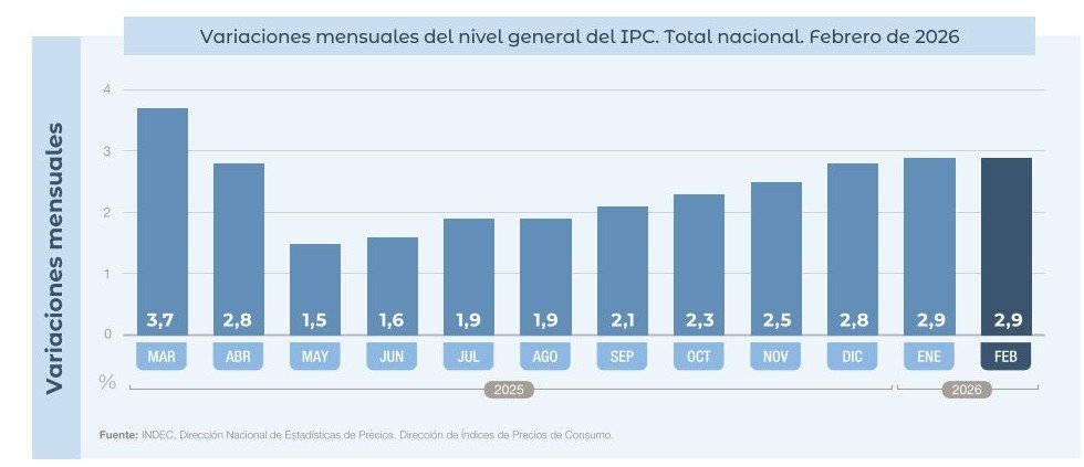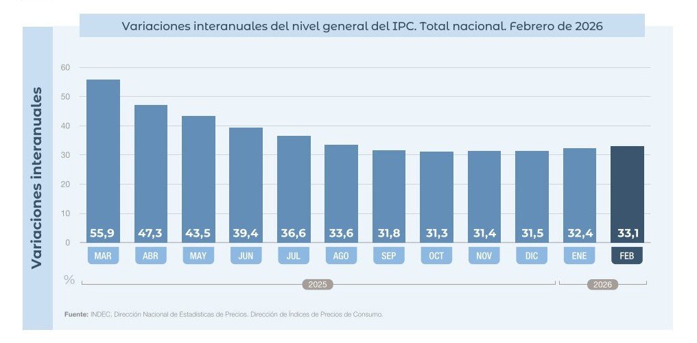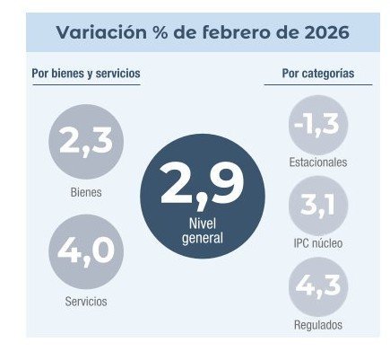 El Nivel general del Índice de precios al consumidor registró un alza mensual de 2,9% en febrero de 2026, y acumuló en el año una variación de 33,1%.