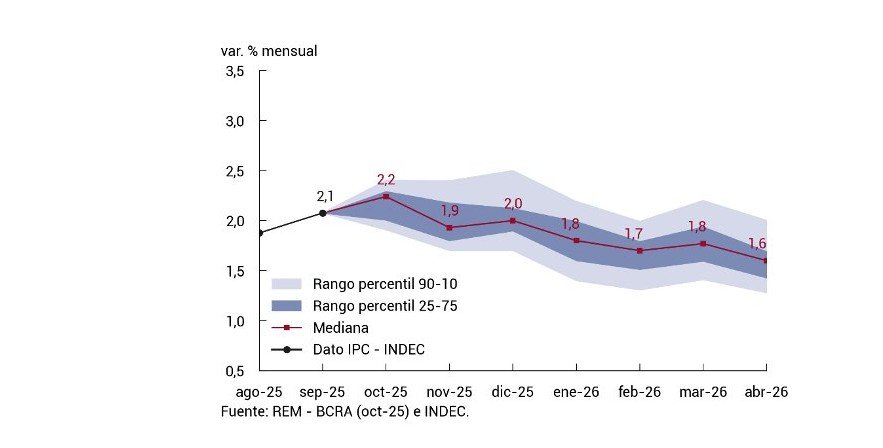 proyecta una inflación nivel general en torno del 2,0% mensual, al tiempo que volvería a un sendero mensual descendente a partir de diciembre hasta alcanzar 1,6% en abril de 2026.